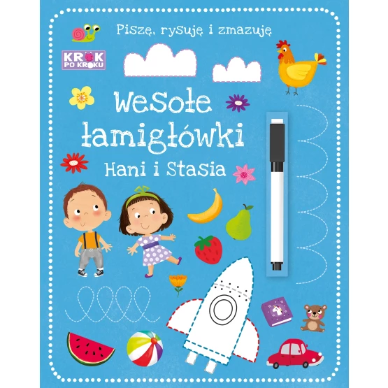 Seria Krok po kroku pomaga małym czytelnikom stopniowo odkrywać otaczający ich świat. Tym razem mogą uczyć się nowych rzeczy i zdobywać nowe umiejętności dzięki wyjątkowym zeszytom zawierającym ciekawe łamigłówki i zadania. Do każdego jest dołączony specjalny flamaster zmywalny, dzięki czemu zabawa z książką nie ma końca.